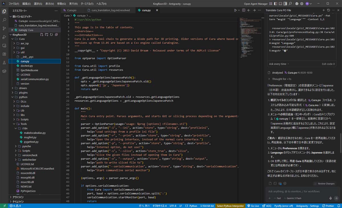 - [python\Tools\i18n\msgfmt.py](file:///d:/AI/KingRoon3D/python/Tools/i18n/msgfmt.py) を使用し、テキスト形式の [Cura.po](file:///d:/AI/KingRoon3D/resources/locale/jp/LC_MESSAGES/Cura.po) をバイナリ形式の [Cura.mo](file:///d:/AI/KingRoon3D/resources/locale/jp/LC_MESSAGES/Cura.mo) へ変換。
