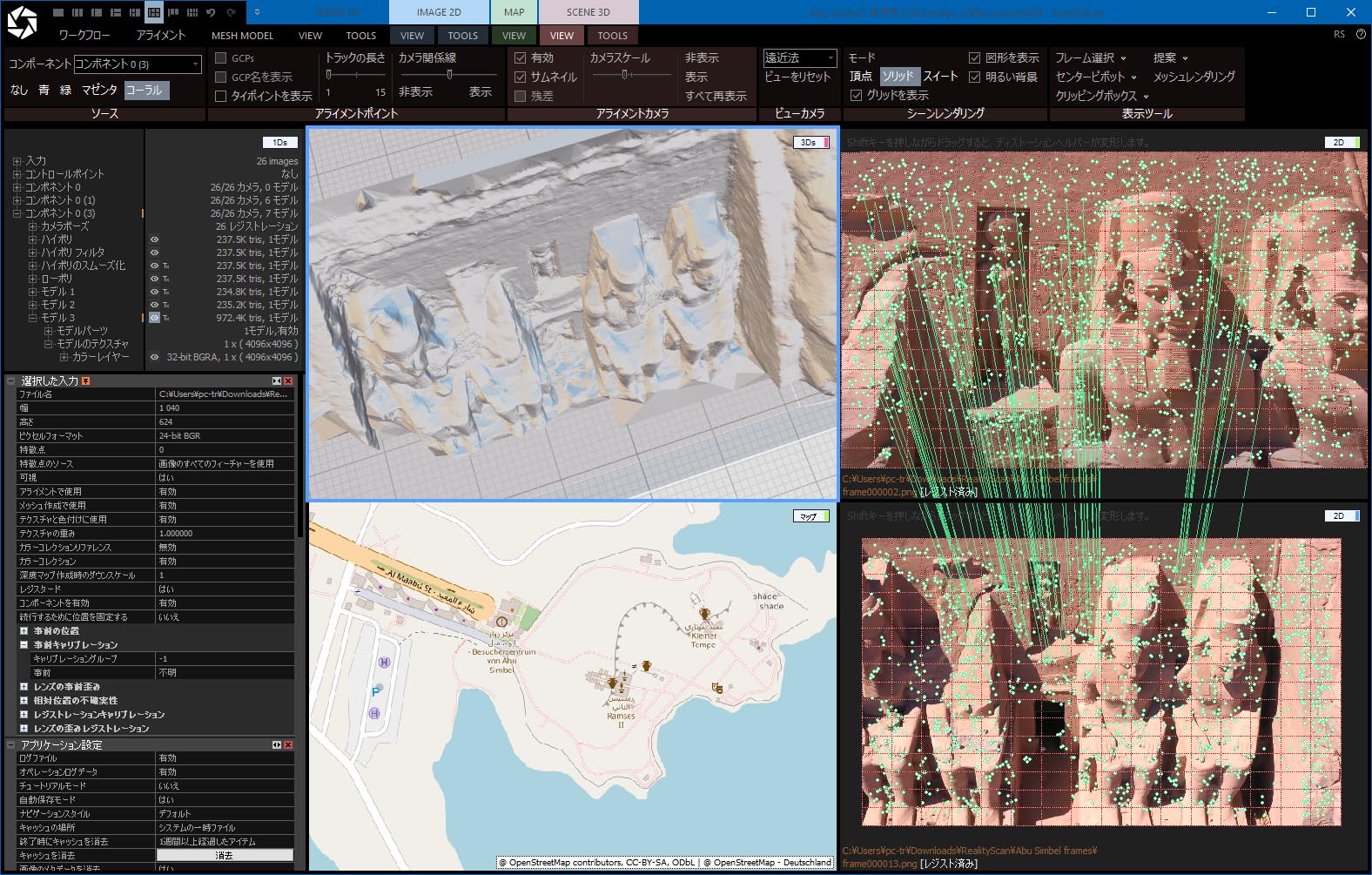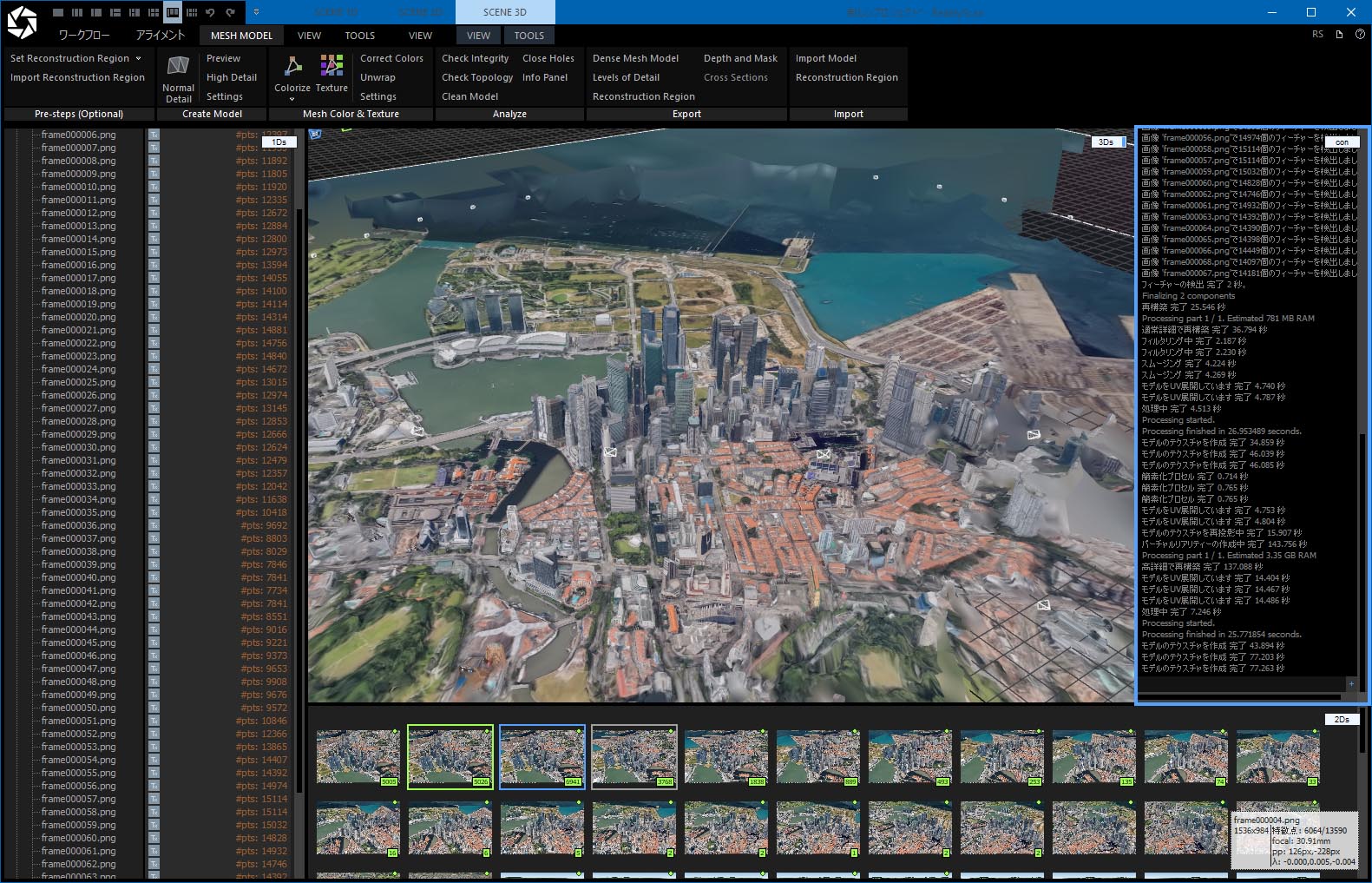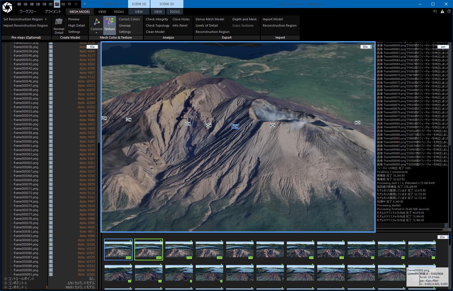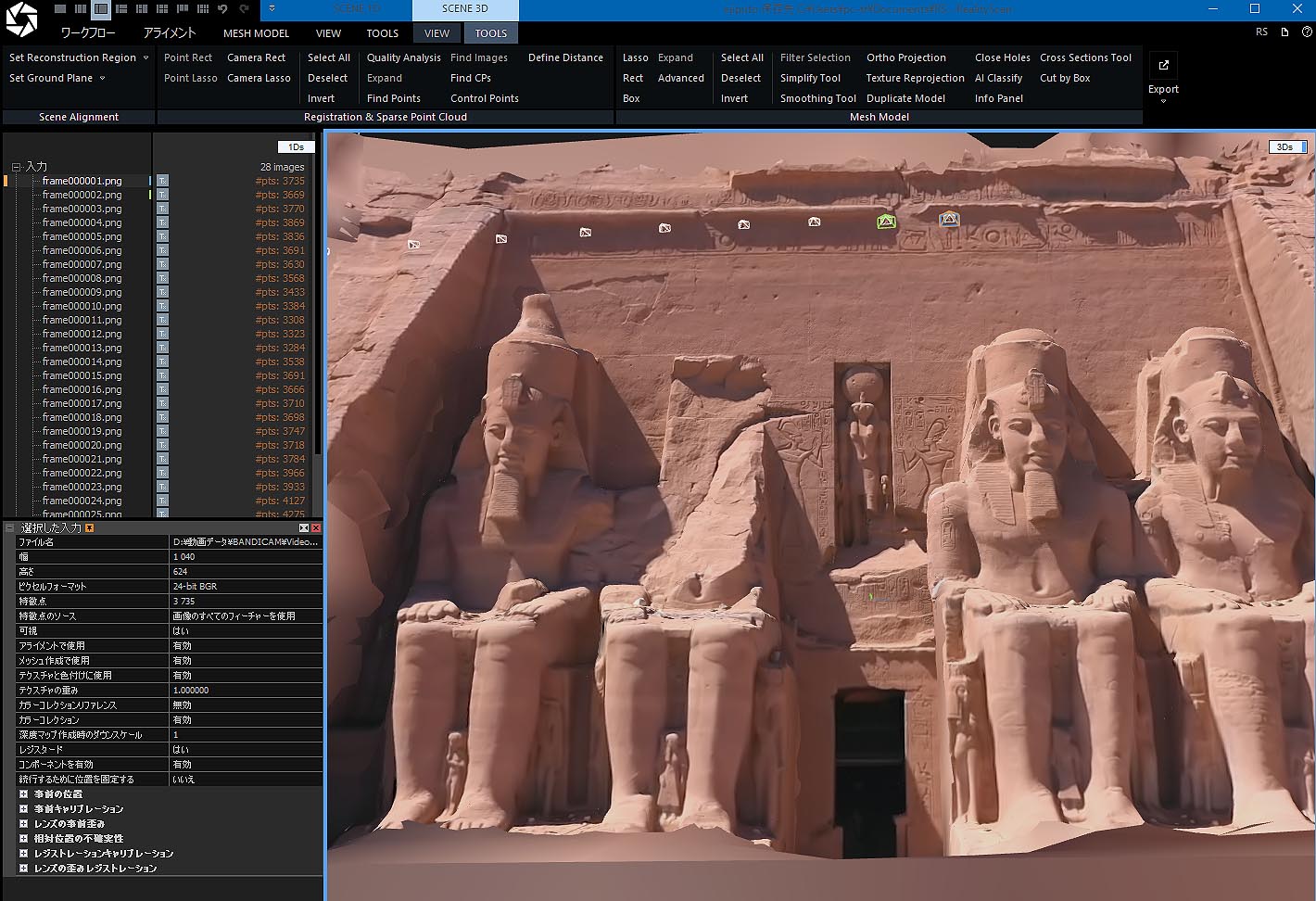 キャプチャーした動画を「ビデオシークエンス」→「アライメント」→「バーチャルリアリティの作成」→ メニューをメッシュモデルに切り替え、「高詳細」→「テクスチャ」→「エクスポート」 の手順で処理。