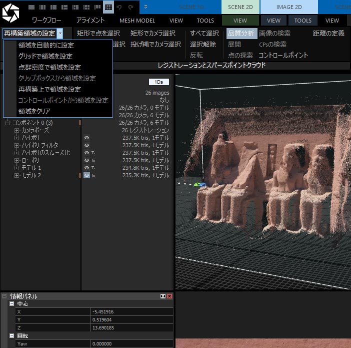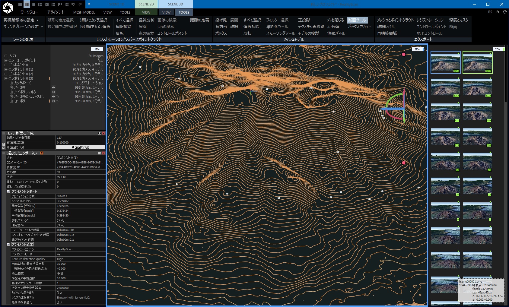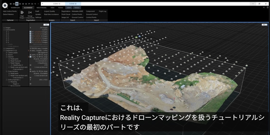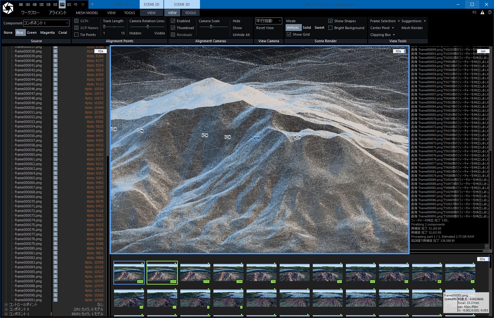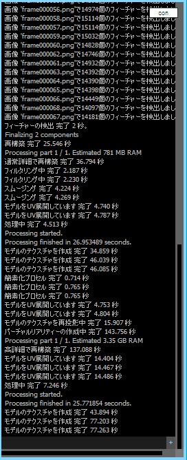 キャプチャーした動画を「ビデオシークエンス」→「アライメント」→「バーチャルリアリティの作成」→ メニューをメッシュモデルに切り替え、「高詳細」→「テクスチャ」→「エクスポート」 の手順で処理。