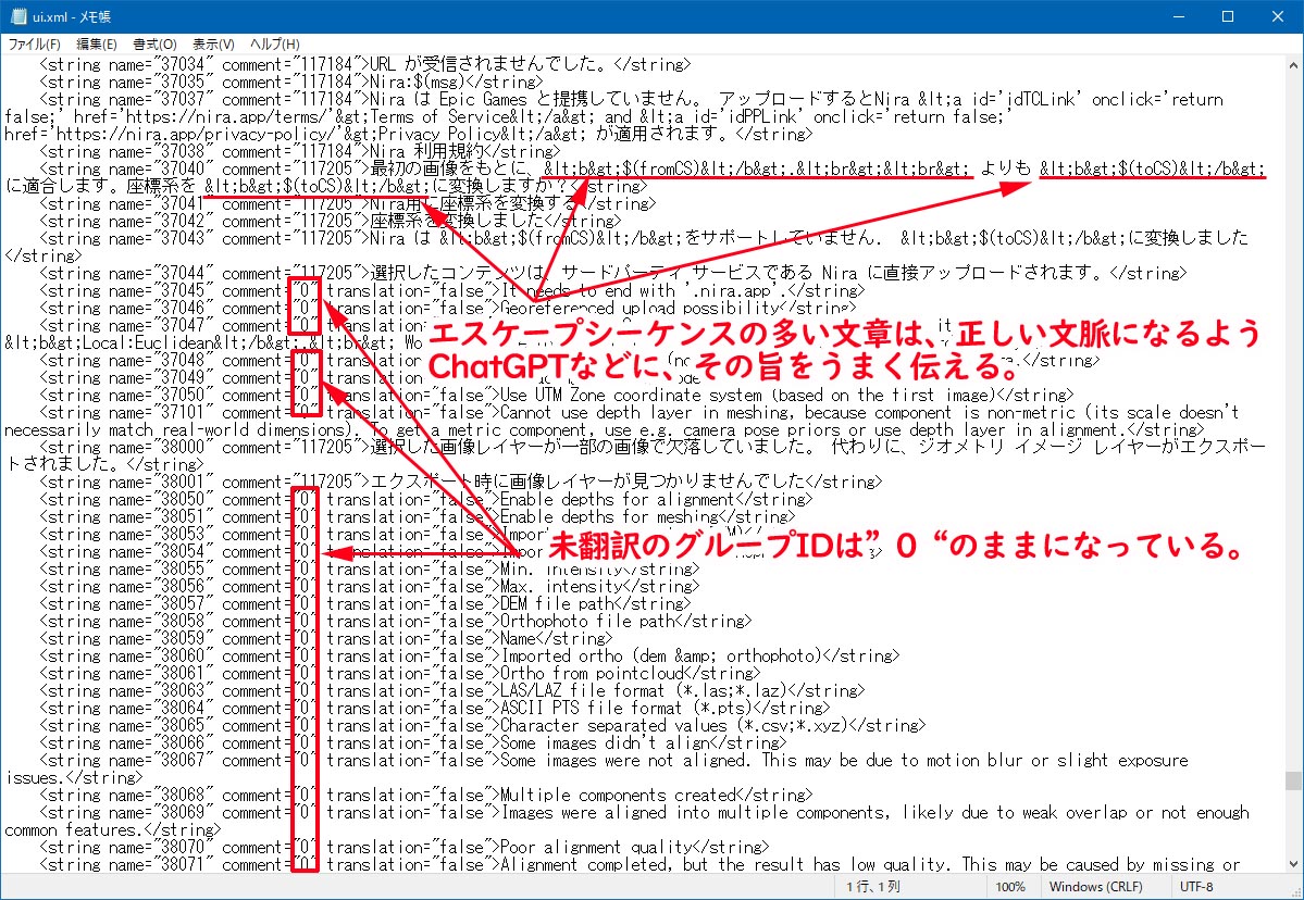 日本語の「ui.xml」ランゲージファイルをメモ帳で開いた様子。