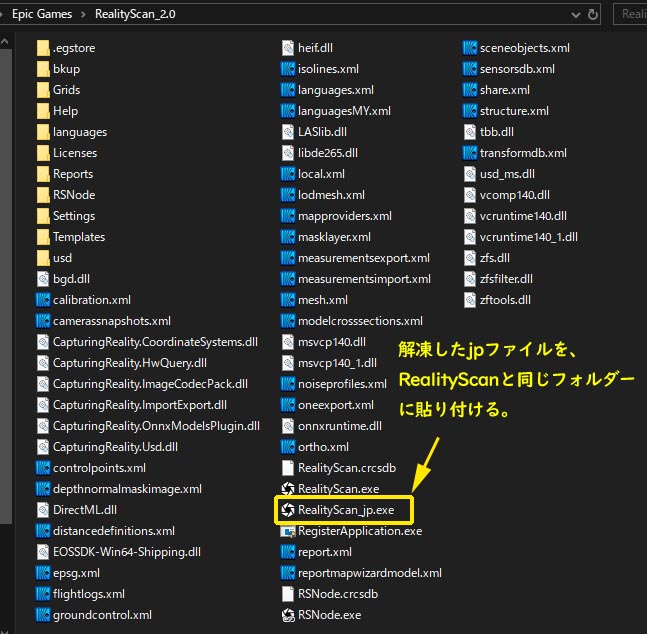 添付ファイルを解凍してコピーをとり、「RealityScan」がインストールされている同じフォルダに内にペーストします。(または解凍したファイルを移動)