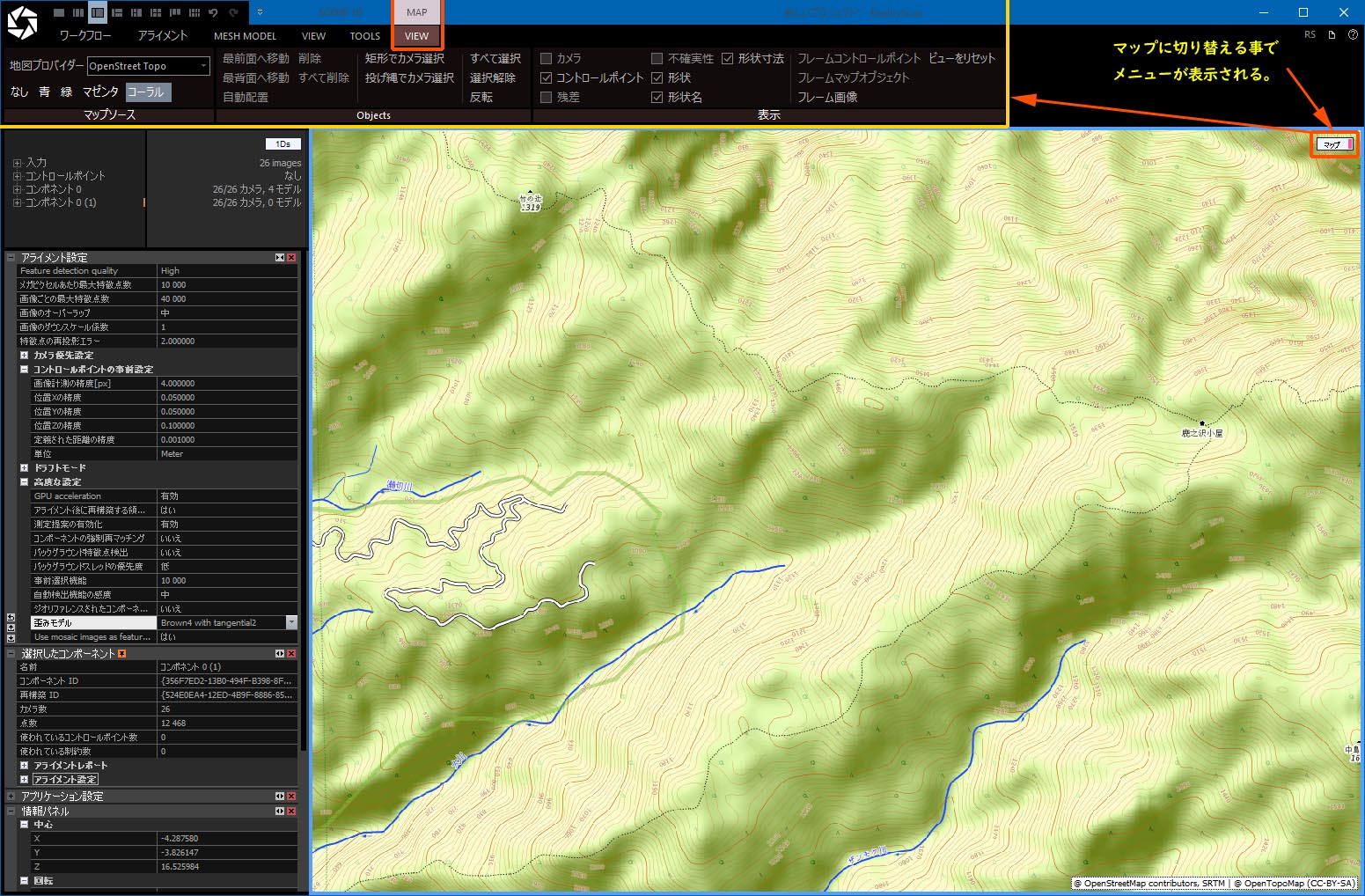 ウィンドウ枠に表示されているOpenStreetMapは、メニューを表示させるためのもので、実際の作業には使用しません。 個人で撮影したドローン画像を使用し、座標系に合わせてメニューから詳細設定を行い、地図と画像の位置がズレないようにします(詳しくはYouTube動画をご覧ください)。