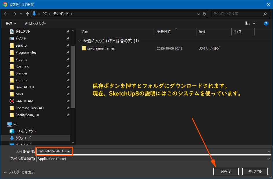 試しに下のリンクをクリックして、開いたエクスプローラーの、保存ボタンを押してみてください。 SketchUp・日本語版のウンロードが開始されます。 SU8の場合、アイコンは異なりますが、「ゆきの散歩道」で利用しているバージョンと同じものになります。