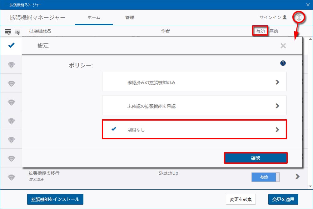 3..拡張機能名の右側にある「有効」ボタンを押し、SketchUp を再起動します。